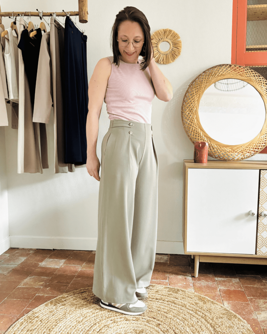 Pantalon fluide en jersey, ajusté à la taille et aux hanches, alliant confort et élégance au quotidien.